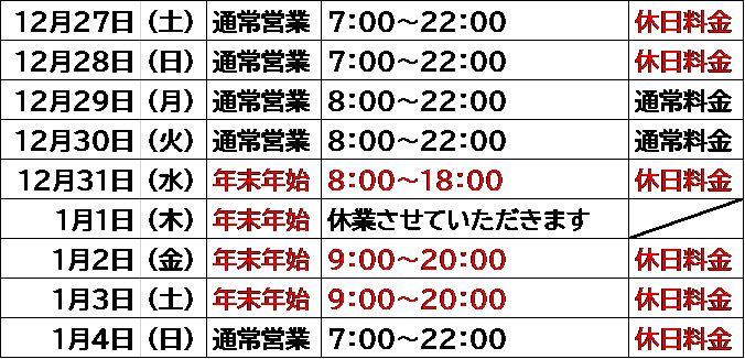 年末年始の営業時間をお知らせします。